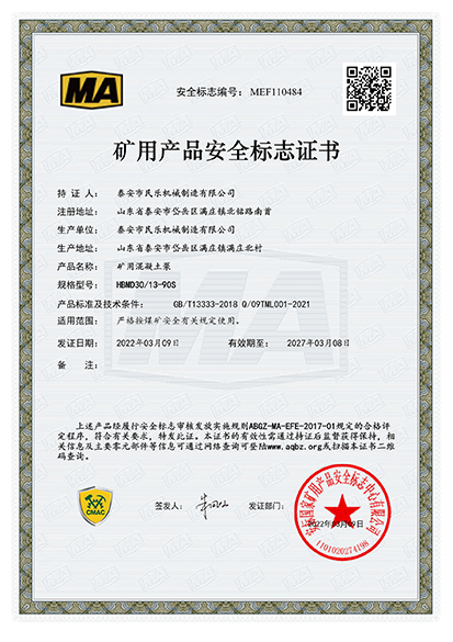 熱烈慶祝我廠礦用混凝土輸送泵通過煤安安全標志證書(煤安編號:MEF110483、MEF110484、MEF110485)。目前公司成功研制出HBMD15/6-22S混凝土輸送泵、以下簡稱“15立方混凝土泵”,且在銷售市場俏銷的形勢下乘勝前進,又試機成功**款新型的高壓大輸送量混凝土輸送泵HBMD30/13-90S混凝土輸送泵、HBMD80/16-110S混凝土輸送泵,目前已成功申辦“煤安標志”,把產(chǎn)品推向市場。